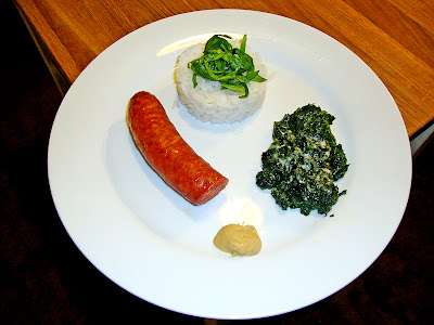 Hungarian Smoked Sausage With Mustard, Spinach Au Gratin & Rice With Spinach Chiffonnade In Lemon Pepper (Epinards au Gratin Variation)